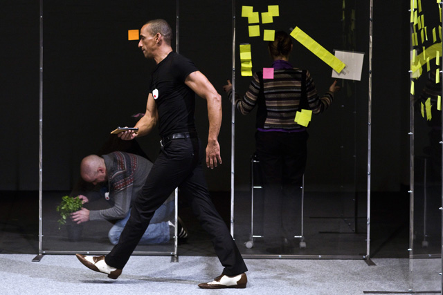 Das Dekor ist spartanisch und lässt den Figuren Platz für ihre sprachliche Selbstvergewisserung: Ein Tisch, drei schwarze Bürocontainer, fünf bewegliche Wände aus Plexiglas, um sich abzugrenzen und Räume zu gestalten: das wars. Als Requisite kommen noch ungefähr 200 Klebezettelchen dazu, die vor allem Anne liebt, um ihre vielen Geschäftsgedanken zu sortieren.