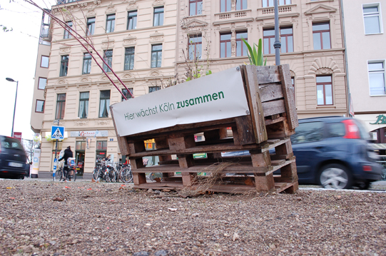 Habt Ihr gesehen? Sie ist wieder da! Krumm und schief, ziemlich zerzaust, arg mitgenommen. Aber sie lebt! Die Holzkiste mit dem Banner „Hier wächst Köln zusammen“ ist auf den Chlodwigplatz zurückgekehrt. Im Mai war sie wie aus dem Nichts aufgetaucht. Baumspinat und Ringelblumen wuchsen um die Wette. Dann war sie verschwunden. Bauarbeiter und ein Bagger hatten das Regiment übernommen.