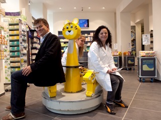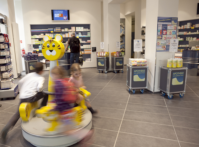 nehmen würde. Als vor gut 14 Tagen an der Außenfassade zwei große Leuchtschilder mit jeweils einem roten „A“ montiert wurden, war Stress vorprogrammiert. Sollte sich tatsächlich dort ein neuer Apotheker breit und vor allem Jürgen Büsch und seiner Apotheke „Zum goldenen Horn“ Konkurrenz machen? Nicht wenige dachten schon an eine Protestaktion und wollten sich mittels Unterschriftenliste dagegen wenden. Entwarnung, Leute, Entwarnung! Das „Goldene Horn“, das seit 111 Jahren für die Medikamentenversorgung in der Südstadt zuständig ist, hat die Seiten gewechselt, das alt-ehrwürdige Lokal auf der Bonner Straße 22 verlassen und 50 Meter weiter statdtauswärts, die großzügige, von Grund auf restaurierte, ehemalige Schlecker-Filiale bezogen. Keine Angst: auch das gelbe Karussell steht natürlich im neuen Laden bereit, damit Ihr eine Runde drehen könnt. Jürgen Büsch ist heilfroh, dass die Strapazen endlich ein Ende haben, hatte er in den letzten Monaten gleich zwei Jobs zu verrichten: als Apotheker im alten Horn und als Bauleiter im neuen. Ich war gestern Nachmittag dort, als Nachbar Christoph, den Ihr ja alle aus der „Sendung mit der Maus“ kennt, gemeinsam mit