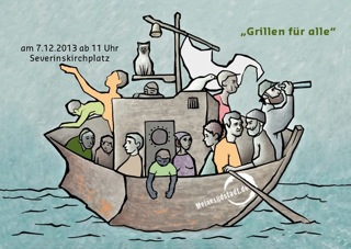 arbeitete. John hat dem Land den Rücken gekehrt, kam nach Deutschland, wurde zweiter Gewinner in einer Kochshow und verdingte sich fortan als Koch. Wie er letztlich zu einem der coolsten Veganköche wurde, lest Ihr im Artikel „Der Affe in der Küche„. Traut Euch ruhig einmal, die „Lasagne ohne Pferd“ nachzukochen (Rezept ist aufgeführt). Für mich war dies die beste Lasagne meines Lebens, obwohl ich wahrlich Fleisch in sämtlichen Variationen liebe. Für die Vegetarier oder Veganer haben wir am kommenden Samstag beim „Benefizgrillen 2013“ auf dem Severinskirchplatz lediglich Stockbrot an Bord. Die Freunde des gegrillten Fleisches wählen dann die „Himmel un Ääd“-Bratwurst vom Hennes. Ihr alle seid natürlich herzlich eingeladen, mit uns einen Bio-Glühwein oder -punsch zu trinken und einen Taler in die Spendenbüchse zu werfen. Wenn jemand von Euch einen guten Draht zu Petrus hat, könnte der oder die ja ein bisschen Schnee in der Zeit von 11 – 18 Uhr wünschen. Das wäre herrlich. Bis die Tage, Euer Andreas.