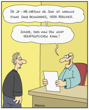 Die Marketingfrau vom Verlag rief mich damals an und sagte, es gibt bald den Cartoon No.3000, ob ich nicht was ganz Besonderes machen könne. Sowas klappt natürlich überhaupt nicht. Dann zeichnete ich den Cartoon, der aus der Situation besteht, dass man den vorgestellten Cartoon nicht sehen kann. Den kennt keiner, und es wird nie einer in Erfahrung bringen, was das war.