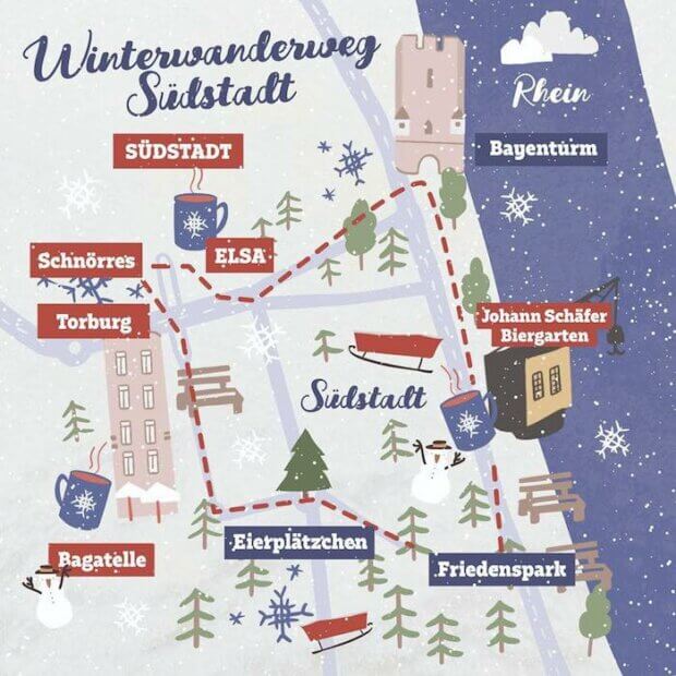 Da sich viele von Euch derzeit draußen sehr viel wohler als drinnen fühlen, haben kluge & kreative Köpfe den Glühweinwanderweg einfach in den Winterwanderweg umgewandelt. Das bedeutet, an verschiedenen Locations quer durchs Veedel gibt es draußen leckere Getränke & Snacks zu kaufen. Platz genug ist jedenfalls da, um mit Abstand eine gute Zeit mit seinen Freunden zu haben. Neben der Bagatelle und dem Biergarten Johann Schäfer nimmt auch die Torburg teil. Hier könnt Ihr täglich ab 15 Uhr Hülyas berühmte Frikadellen kosten.