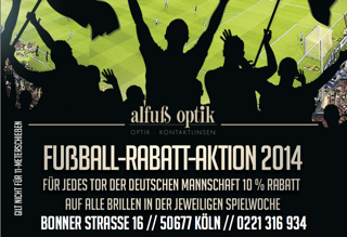 Wie schon Jean-Paul Sartre, der französische Romancier, Dramatiker, Philosoph und Publizist, ganz richtig wusste: „Bei einem Fußballspiel verkompliziert sich allerdings alles durch die Anwesenheit der gegnerischen Mannschaft.” Das Salz in der WM-Suppe jedoch sind die Tore – und wenn die deutsche Nationalmannschaft Tore erzielt, purzeln die Preise bei Sven Hartje und seinem Team. Für jedes geschossene Tor der Deutschen Nationalmannschaft erhält man 10% auf alle Brillen und Sonnenbrillen in der jeweiligen Spielwoche. Wenn Poldi, Schweini, Philipp & Co. zum Beispiel 5:1 gegen Portugal gewinnen, kosten die Sehhilfen nur noch die Hälfte. Dieses Angebot gilt jedoch nicht bei Elfmeterschießen. Der maximale Rabatt pro Spielwoche leigt bei 50%.