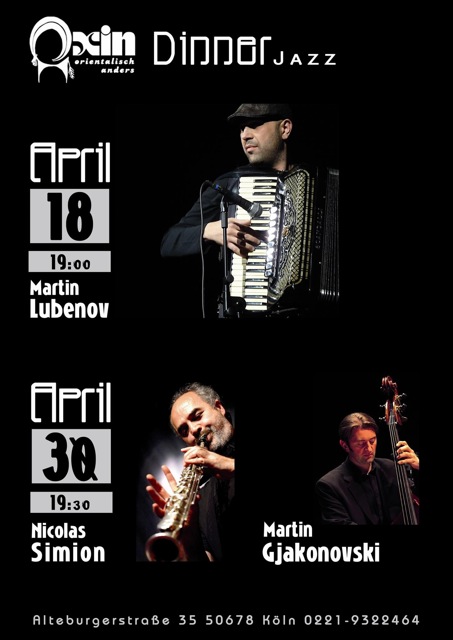 Medih Tabatabai hat im April 2013 drei bekannte Musiker aus der Jazzszene ins Restaurant Oxin auf der Alteburger Straße 35 eingeladen. Den Anfang macht am 18.4.2013 Martin Lubenov. Er ist ein wahrer Meister seines Faches, ein Musiker, der es wie kaum ein anderer versteht, die verschiedensten musikalischen Welten und Traditionen unter einen Hut zu bringen, dessen Virtuosität an seinem Instrument inzwischen auch in den fernsten Regionen bekannt ist und der nach Jahren immer noch die Gabe besitzt, sich selbst immer wieder neu zu erfinden: der aus Bulgarien stammende und in Österreich lebende Ausnahmeakkordeonist Martin Lubenov. Es sind nicht nur mehr die ausgewiesenen Liebhaber weltmusikalischer Klänge, die der Musiker zu begeistern weiß. Mit seiner Offenheit fast allen musikalischen Strömungen gegenüber vermag er auch die Herzen von Jazz- und sogar Popfans anzusprechen. (Reinhören bei MySpace).
