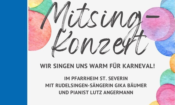Mit Rudelsingen-Sängerin Gina Bäumer und Pianist Angermann. Tickets gibt es im Pfarrbüro oder bei Sophie Wesselkamp (01628843465 oder per Mail an Sophie.wesselkamp@severin-koeln.de). Kostüme sind erwünscht.