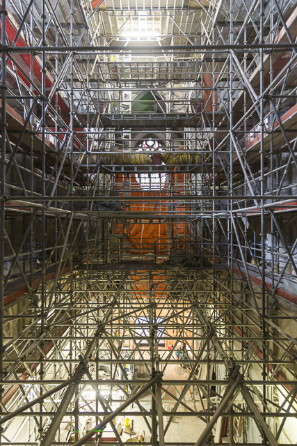 Die Verzögerung hat aber auch den -zugegeben gänzlich profanen- Vorteil, dass man sich noch länger a dem Wunderwerk der Gerüstbau-Kunst erfreuen kann, das das Innere von St. Severin derzeit nahezu komplett ausfüllt. Wenn man von oben unter dem Kirchendach auf dieses verwirrende aber akribisch kalkulierte Geflecht aus Rohren und Verstrebungen blickt, hat das Ganze schon fast etwas von einem erhabenen Kunstwerk. Von mir aus könnte das gern so stehen bleiben. Was aber kaum passieren wird, da es die traditionelle Nutzung des Kichenraums doch etwas einschränken würde. (Das zweckdienliche Artefakt ist, wenn auch nicht in vollem Umfang, natürlich auch von der Kerzenkapelle hinter dem Haupteingang zu bestaunen.) Mein bis dato nicht sonderlich ausgeprägter Respekt vor dem Beruf des Gerüstbauers ist jedenfalls immens gestiegen. Und letztlich werden die Jungs auch dazu beitragen, die stehende Turmuhr wieder ans Laufen zu bringen. Die Reparatur muss nämlich von außen erfolgen. Was deutlich vor der Wiedereröffnung geschehen soll. Das nötige Rüstzeug ist ja massenhaft da.