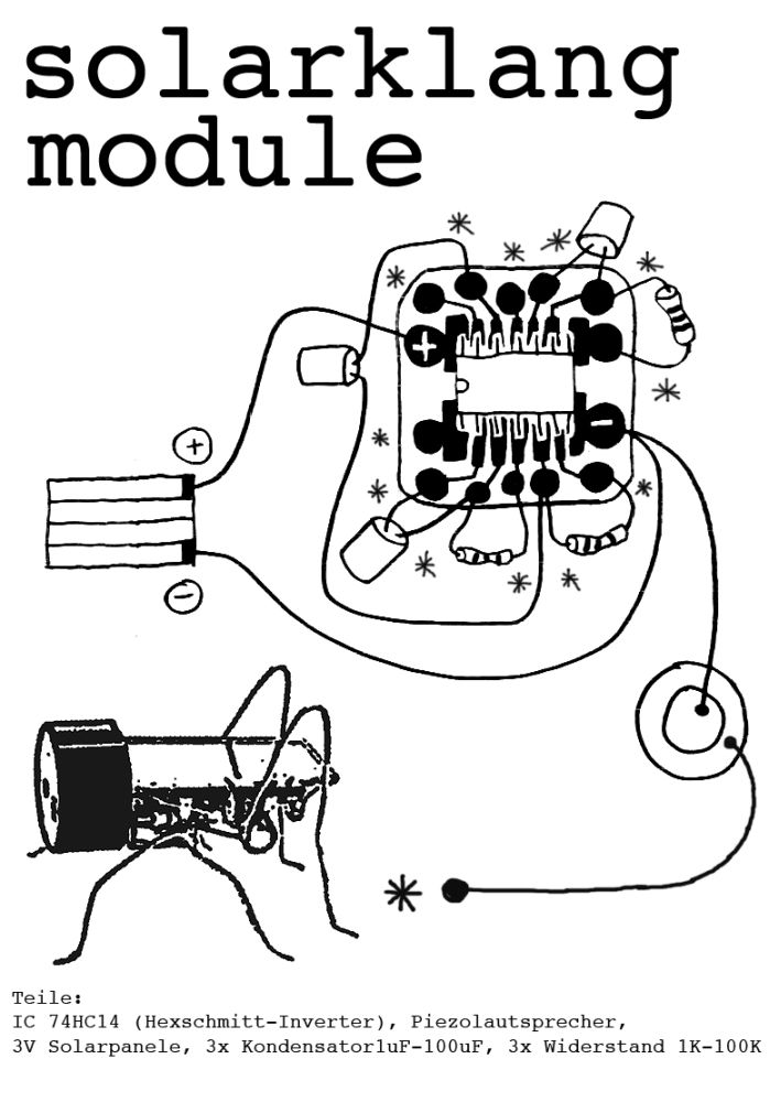 Sie begeben sich an Orte eben dieses Leerstandes, die der Spekulation trotzen, begrünt und renaturiert werden. Aus Leerstand wird Kunst, aus Grau wird Grün. Das Publikum ist eingeladen, an einem Familienworkshop teilzunehmen, im Grünen zu essen und zu trinken, Ausstellungen sehen, Klaninstallationen zu erleben, zwei Konzerte zu hören oder einfach nur einen schönen Tag im Garten zu verbringen. Eintritt fei, um Spenden wird gebeten. Für Kinder & Jugendliche ab 8 Jahren (jüngere Kinder in Begleitung von Eltern/ Geschwistern) können an halbstündigen Workshops Singende Ästchen zwischen 17 22 Uhr teilnehmen. Unter Anleitung werden kleine solarbetriebene Apparate gelötet und gebastelt. Sie erzeugen leise, variable Klänge, die an Insektengesänge erinnern und sich mit der Lichtintensität verändern. 5 Euro pro Person.