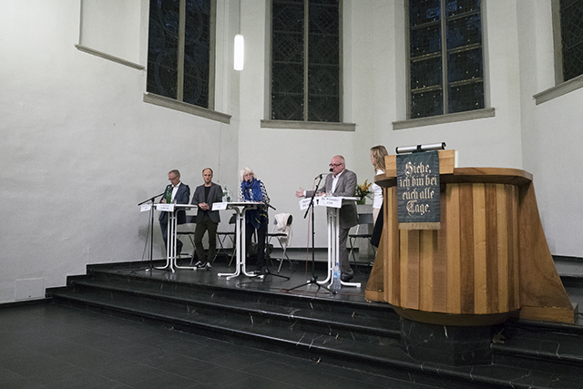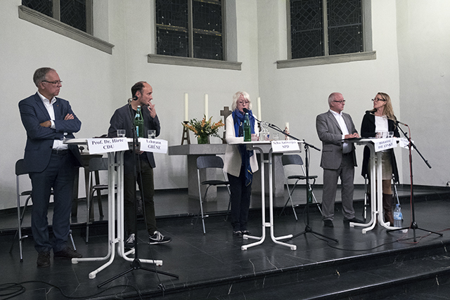Unter der Moderation von Pfarrerin Dr. Anna Quaas und Pfarrer Mathias Bonhoeffer diskutierten Elfi Scho-Antwerpes, Bundestagsabgeordnete der SPD, Professor Dr. Heribert Hirte, Bundestagsabgeordneter der CDU, Sven Lehmann (Grüne), Dr. Annette Wittmütz (FDP) und Matthias W. Birkwald, für Die Linke im Bundestag. Pfarrerin Quaas stellte die Politiker vor.