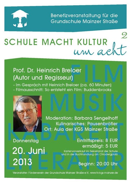 Die Grundschule Mainzer Straße öffnet die Türen – für Kultur. Unter dem Titel „Schule macht Kultur“ ist am 20. Juni 2013 um 20 Uhr der in der Südstadt lebende Autor und Regisseur Prof. Dr. Heinrich Breloer zu Gast. Der mehrfache Grimme-Preiträger berichtet über die Entstehung des Films die „Buddenbrooks“. Den Abend moderiert Schulleiterin Barbara Sengelhoff. Karten zum Preis von € 8.- sind im Sekreteriat der Schule oder in der Buchhandlung am Chlodwigplatz erhältlich.