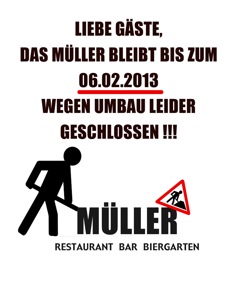 Zurzeit wird im Haus Müller kräftig renoviert. Die Küche wird komplett erneuert, der Gastraum wird erweitert – das gesamte Erdgeschoss renoviert. Die Freude der guten, alten Holztheke können jedoch beruhigt aufatmen, denn die bleibt genau so erhalten. Bis zum 6. Februar 2013 (Weiberfastnacht) sind dann die Roharbeiten abgeschlossen – dann kann mit Simone Wyler, Jörg Holtwick und dem Müller-Team gemeinsam „in die Hände gespuckt“ und unter dem Motto „Baustelle“ kräftig gefeiert werden. 14 Tage lang nach Ende der Session werden dann die Feinarbeiten getätigt, dem „neuen“ Haus Müller Farbe verpasst und der Boden verlegt.