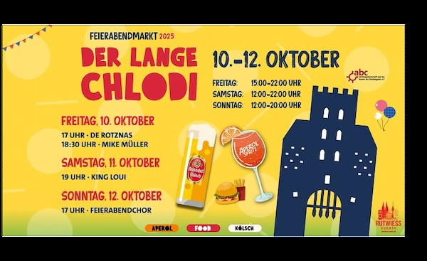 Wenn der goldene Oktober den Chlodwigplatz verzaubert, wird aus Kölns Feierabendmarkt ein dreitägiges Genuss-Festival mit Musik mitten in der Südstadt. Entspannt, lecker, kölsch – der lange Chlodi in XXL! Euch erwartet: After-Work-Vibes & Kölsche Trinkkultur, Streetfood von Pizza bis Reibekuchen, Indian Food, Reibekuchen, Burger, süß oder herzhaft, Karussell & Hüpfburg für die Kleinen & Live-Musik.