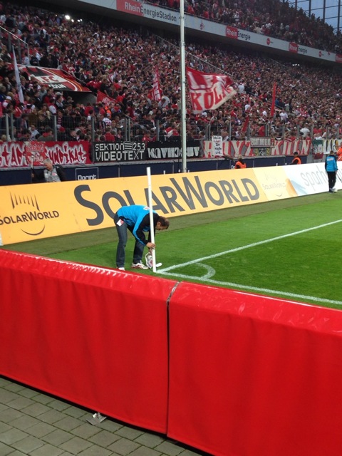 Was zudem ins Auge stach: meinem FC fehlte die spielerische Linie. Ujah wusste auf dem Platz oft nicht wohin mit sich. War ja auch klar, wenn es bei meinen Geißböcken nach vorn an Ideen mangelte. Halfar hatte nach einer missglückten Flanke auch keine Lust mehr auf schlechten Fußball und zerschmetterte wütend die Eckphane (44.). So sehr ich mir zur zweiten Halbzeit einen Wechsel wünschte, Stöger tat es nicht. Der einzige Wechsel war seitens Kölner Sportstätten zu vermelden: die defekte Eckfahne wurde ersetzt.