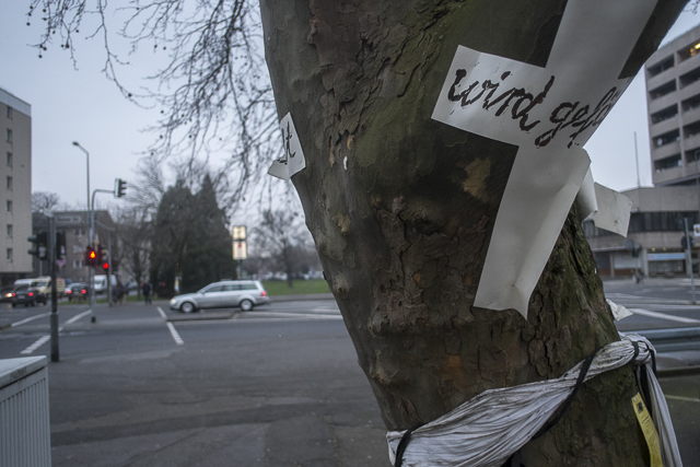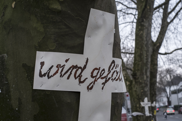 Nach einer guten Stunde kommt allerdings Unruhe auf. Die ersten greifen zu den Mänteln. Otmar Lattorf erinnert noch ein letztes Mal an die samstäglichen Demonstrationen: Wir treffen uns immer um 15 Uhr an der Ecke Bonner Straße/Schönhauser Straße. Wir entscheiden spontan, welche Route wir für unseren Protest wählen. Dann ist der Pfarrsaal von St. Maria Königin leer. Gespalten ist der Eindruck, der bei mir bleibt. Ja, die Leute meinen es ernst mit dem Baumschutz auf der Bonner Straße. Aber warum kam die Nord-Süd-Bahn nur in einem Wortbeitrag der Bürger und in dem auch nur am Rande vor? Gibt es vielleicht für das Baumschutz-Interesse noch andere, eigentliche Gründe? Brauchen die Marienburger die Stadtbahn etwa gar nicht, weil sie sowieso und immer fast alle mit dem Auto fahren? Und wollen sie die Bäume schützen, damit alles so bleibt, wie es ist? Ohne Bahn und den befürchteten Schleichverkehr durchs Veedel? Fragen über Fragen. Antworten am Samstag (20.02.2016). Ab 15 Uhr. Vielleicht.