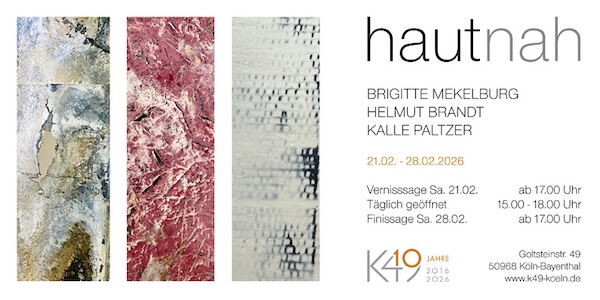 HAUT und NÄHE lassen unmittelbar an Berührung denken. Der Titel „hautnah“ beschreibt diese besondere Nähe, die einer Berührung vorausgeht. Genau darum geht es in den Bildern, Objekten und Skulpturen des Künstlertrios Brigitte Mekelburg, Helmut Brandt und Kalle Paltzer. Während Brandt hauchdünne Acryl-Farbhäute von Glasplatten löst und sie als glatte, gebrochene, rissige oder fragmentierte Schichten auf Leinwände überträgt, suggerieren Paltzers Papierschichten Verletzungen, Äderchen, Gerippe und Zerbrechlichkeit. Mekelburg verwendet Gips, Wachs und Kaseinfarbe für ihre eigentümlichen Kreationen, die sich zwischen Organischem und Gestaltetem bewegen.