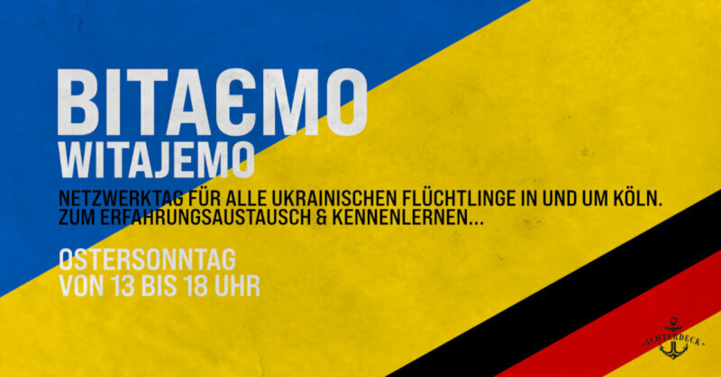 Für den Ostersonntag hat Matze Bauer auf dem Achterdeck eine Vernetzungsveranstaltung geplant, zu der er ukrainische Geflüchtete und ihre Wohnungsgeber*innen, aber auch potentielle Wohnungs- und Arbeitgeber*innen aus Köln und Umgebung einlädt. Von 13-18 Uhr sollen an Deck alle die Möglichkeit haben, sich kennenzulernen und auszutauschen – für Essen und Getränke ist gesorgt.