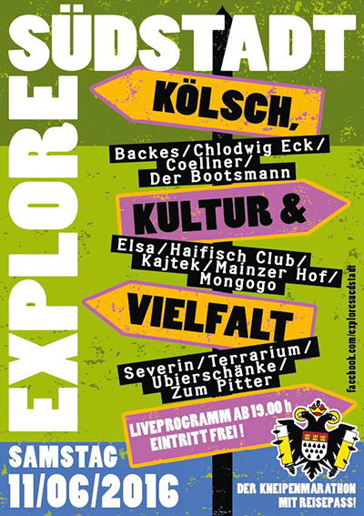 Wer unser Veedel noch mal neu, auf eine andere Art entdecken möchte, nehme einfach am Kneipenmarathon 2016 Explore Südstadt am Samstag teil. Los geht es am um 19 Uhr. Insgesamt 13 Südstadt-Kneipen machen mit. Wer alles dabei ist und was in den Kneipen musikalisch läuft, entnehmt Ihr unserem Terminkalender. Viel Spaß beim Entdecken!