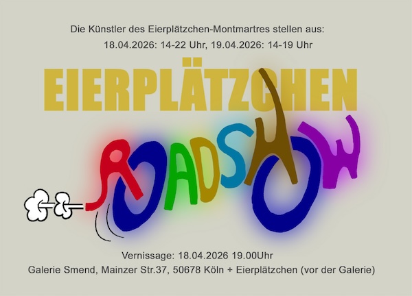 Parallel stattfindende Aktionen und Livepainting: am Samstag & Sonntag von 14-19 Uhr auf dem Eierplätzchen (Kreisverkehr Teutoburger Str./Mainzer Str.) und in der Galerie Smend in der Mainzer Str. 37.