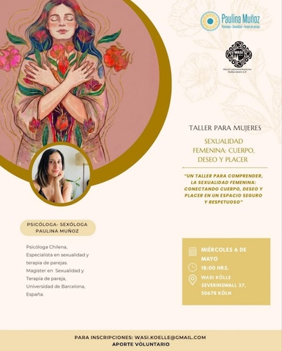 Paulina Muñoz verbindet in ihrem Workshop Körper, Verlangen und Lust in einem sicheren und respektvollen Raum. Der Workshop für Frauen findet auf spanisch statt. Anmeldung per Mail an wasi.koelle@gmail.com
