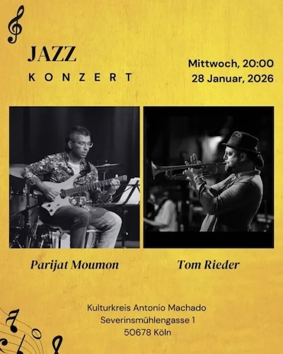 Deutsch-Spanischer Kulturkreis Antonio Machado Severinsmühlengasse 1, Köln, DeutschlandWenn draußen Frost herrscht, wird es drinnen umso wärmer: lateinamerikanische Musik, gute Stimmung und ein Abend voller Salsa, Leidenschaft und Gemeinschaft. Perfekt, um dem Winter zu entfliehen und gemeinsam zu feiern. Mit seiner Stimme, Gitarre und seinem unverwechselbaren kubanischen Stil bringt Ney Portales die Tanzfläche zum Glühen und lässt den Winter schnell vergessen.