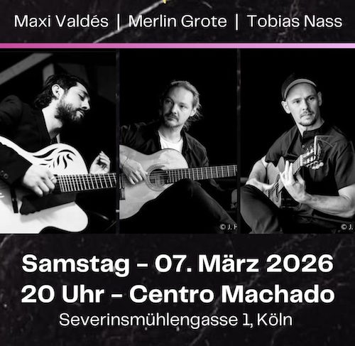 Die „Noche de Guitarras“ im Centro Machados vereint die drei Gitarristen Maxi Valdés, Tobias Nass und Merlin Grote und nimmt euch mit auf eine klangvolle Reise durch die Gitarrenmusik Südamerikas und Spaniens. Auf dem Programm stehen sowohl eigene Kompositionen als auch bekannte Werke aus den Genres Jazz, Flamenco und Latin. Das Konzert bietet ein vielseitiges […]