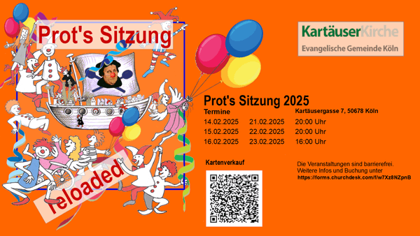 Das bedeutet Karneval, Musik, Kabarett, Krätzchen, Süffele, Müffele und alles, was PROTs seit über 25 Jahren ausmacht! Nach einigen kleineren Versionen von PROTs mit dem „Pointenbasar“ und der „Show zwischen Kirche, Kölsch und Kabarett“ ist sie im 80 Plätze bietenden Kreuzgangsaal der Kartäuserkirche wieder da: die legendäre PROTs-Sitzung – mit allem, was dazu gehört: Ob kölsches Liedgut, ob Musical, ob Wahlkampf oder Abendmahl.