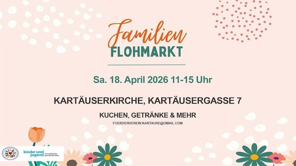 mit Essen, Getränken und mehr. Der Frühling ist da! Ihr sucht gut erhaltene, gebrauchte Kleidung für eure Kids oder wollt Platz in eurem (Kinder-)Kleiderschrank schaffen? Dann ist dieser Familien-Flohmarkt des Familienzentrums Kartause genau das Richtige für euch. In den schönen Räumen der Kartäuserkirche sowie den angrenzenden Gärten gibt es Schätze zu entdecken sowie Kaffee und Kuchen.
