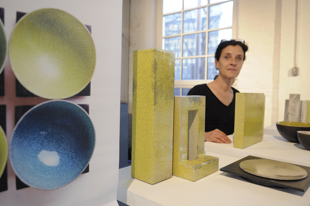 Wie Enno Jäkel, der mit seinen Vasen und Porzellanskulpturen aus Ehrenfeld angereist ist. Das ist die häufigst gestellte Frage, wie denn die Oberfläche solch eine Struktur bekommen kann, erzählt er, und erklärt sodann anschaulich die Machart seiner Objekte: penibel genau legt er die Muster auf und erreicht dann durch Dehnung der Oberfläche die spezielle organische Struktur.