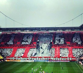 Die Fans sind es bereits! Erstklassig! Was die Südtribüne mal wieder für eine Gänsehaut-Choreographie hinlegte, war der helle Wahnsinn! Auf einem riesigen Banner stand „50 Jahre Deutscher Meister“, und in der Mitte wurde Transparent mit Bild von Hans Schäfer, der die Meisterschale von 1964 in den Händen hielt, nach oben gezogen.